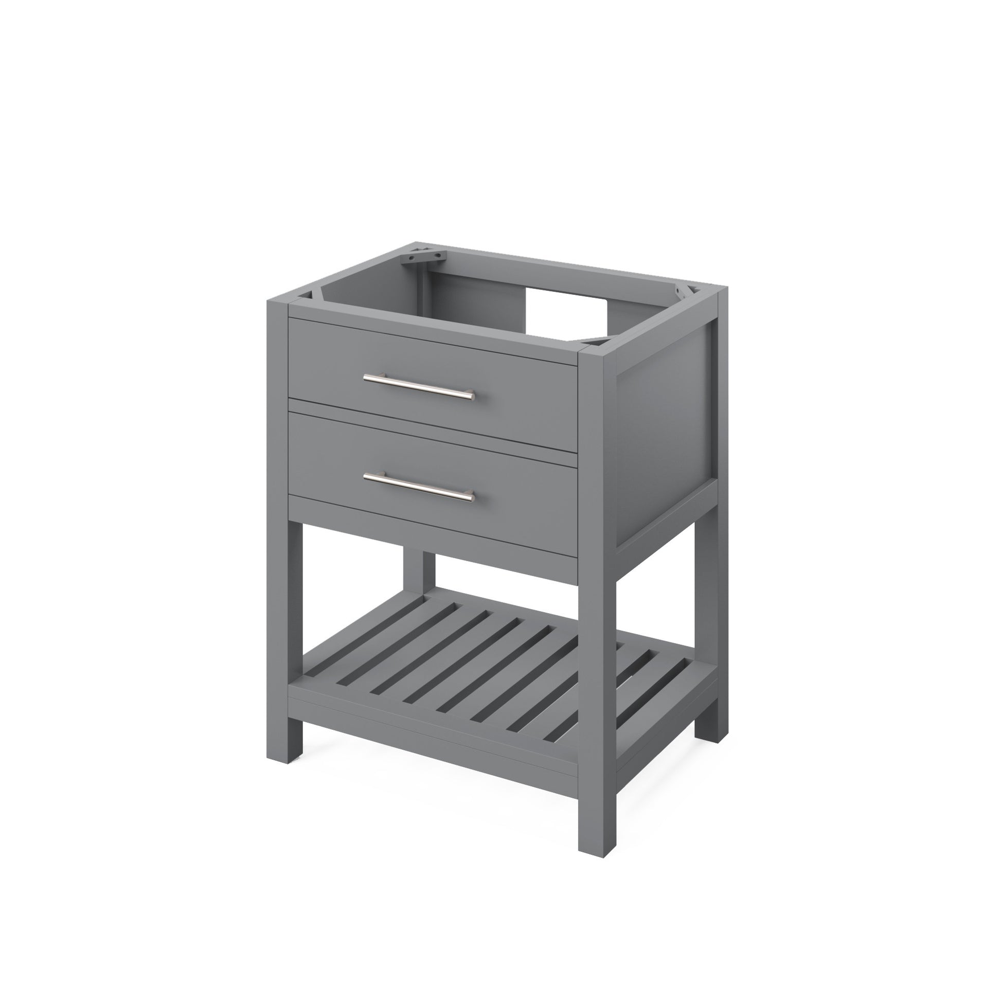 - Tipout storage with custom-sized hardwood tray plus open slatted bottom shelf for optimal storage