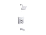 With clean lines and square features, the contemporary Honesty faucet collection draws inspiration from modern European design. This bath and shower valve trim includes a lever handle and push-button diverter as well as a single-function showerhead with Katalyst air-induction technology, which maximizes the air/water mix for a powerful, even flow. Pair this trim with a Rite-Temp pressure-balancing valve with push-button diverter, which maintains your desired water temperature during pressure fluctuations.